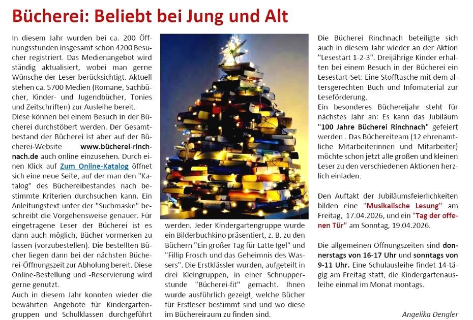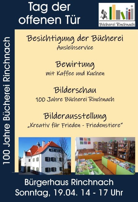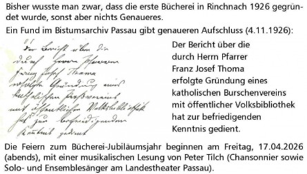 Schon vormittags ab 11 Uhr findet eine offizielle Jubiläumsfeier mit geladenen Gästen statt, mit etlichen Gästen darunter, die sich um die Büchereiarbeit in Rinchnach generell und besonders in den letzten Jahrzehnten verdient gemacht haben. Im Rahmen dieser Feier wird auch ein bebilderter Rückblick auf die 100-jährige Büchereigeschichte erfolgen.